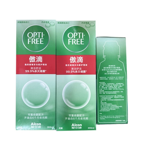 最新效期 爱尔康傲滴 355ml+355ml+恒润90ml 79元 8套 /箱 效期355ml 2025.04--2027.05 90ml 效期2025.01-2027.01 产品名称:隐形眼镜多功能护理液 注册证号:国械注进20163161332