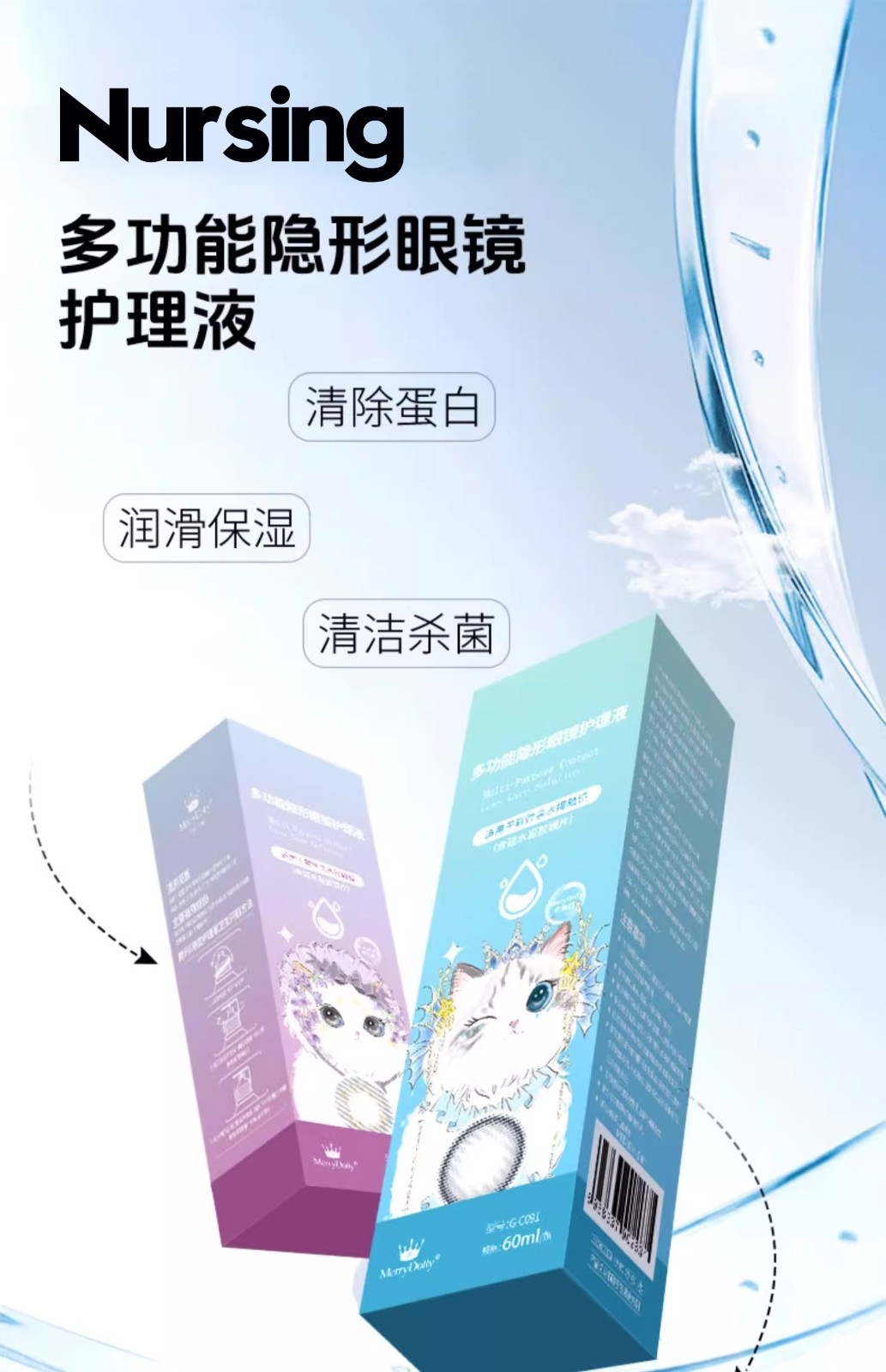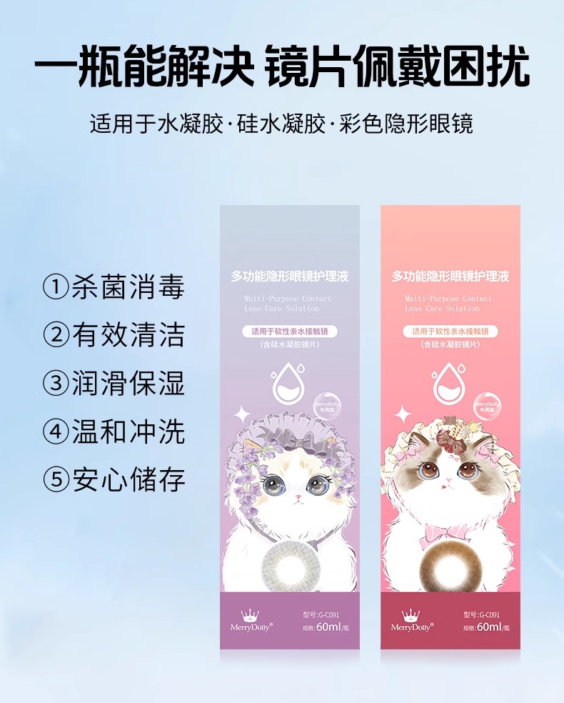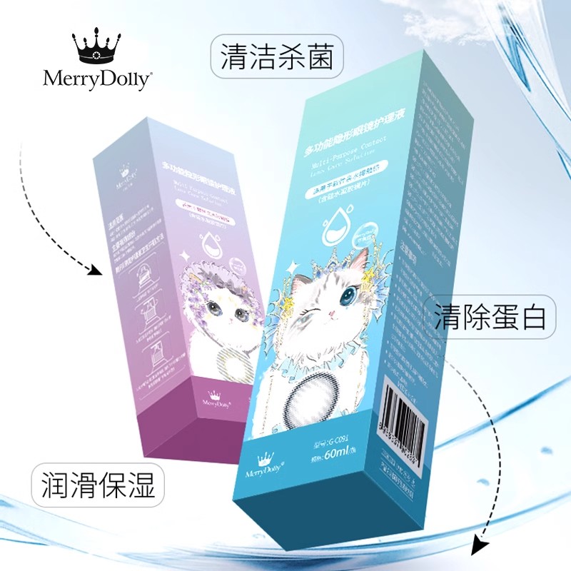 merrydolly 萌宠系类 护理液 60ml 2.5元/瓶 10瓶一组 120瓶/箱 效期 2025.01--2027.01 生产企业 :安徽维视达康光学科技有限公司 注册证号:国械注准20173164213