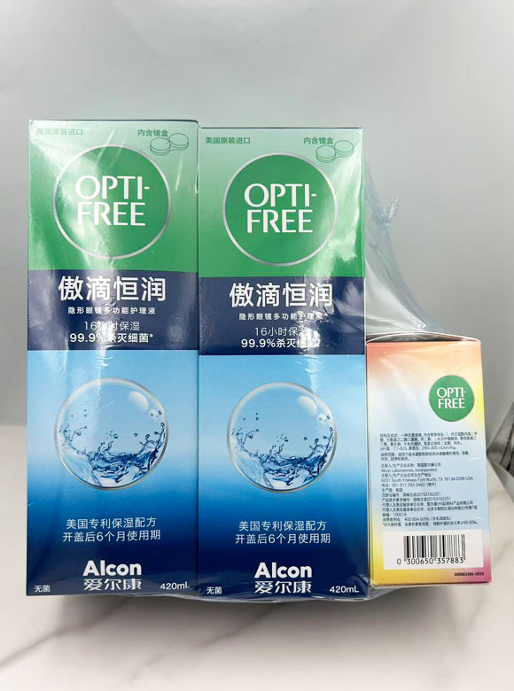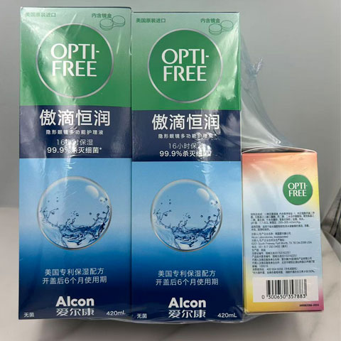 爱尔康恒润系列: 420ml +420ml+乐明60ml 有效期: 恒润420ml:2025-02--2028.01 乐明60ml:2025-05--2027.5 产品名称:隐形眼镜多功能护理液 注册证号:国械注进20153162252