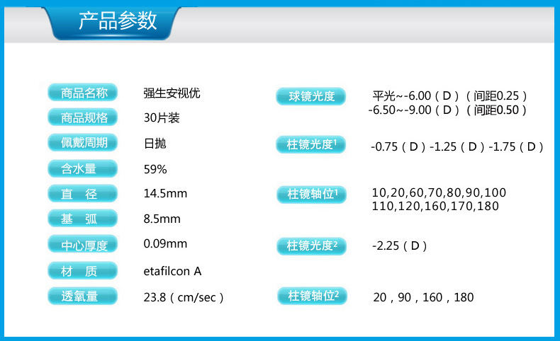 1.强生安适优舒日30片日抛散光片为厂家量产,光度范围以及轴位请仔细核对以下产品参数。 2.为了确保您所定制镜片的准确性,请在订单附言中注明球镜(近视)/柱镜(散光)/轴位以及您所填写的度数为 “已换算的隐形度数”还是“未换算的框架度数”。 产品名称:软性角膜接触镜